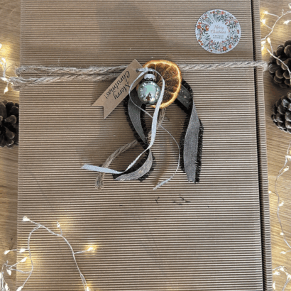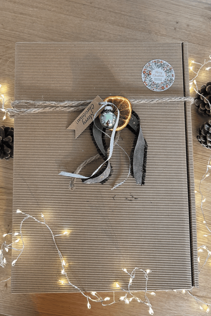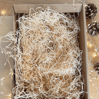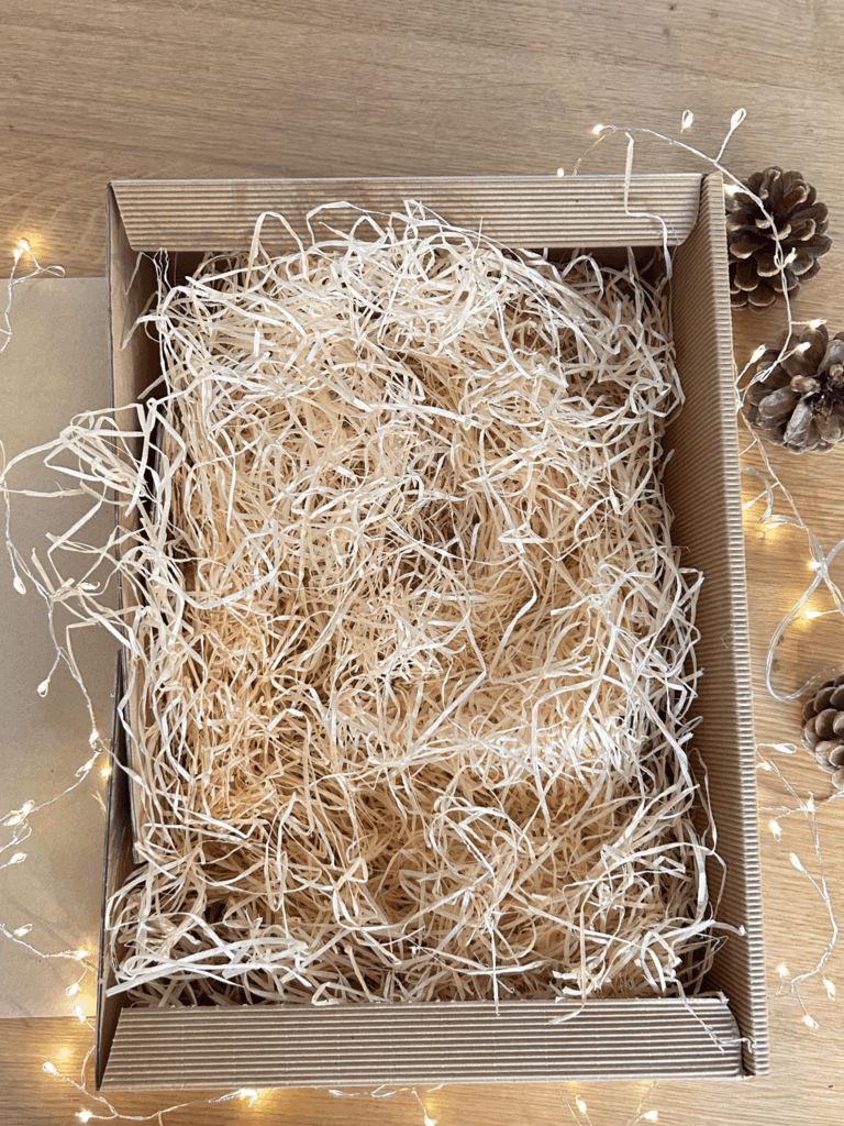 Liebevoll dekorierte Geschenkbox aus hochwertiger Naturwellpappe – gefüllt mit feiner Holzwolle und verziert